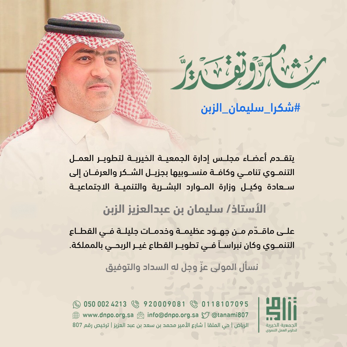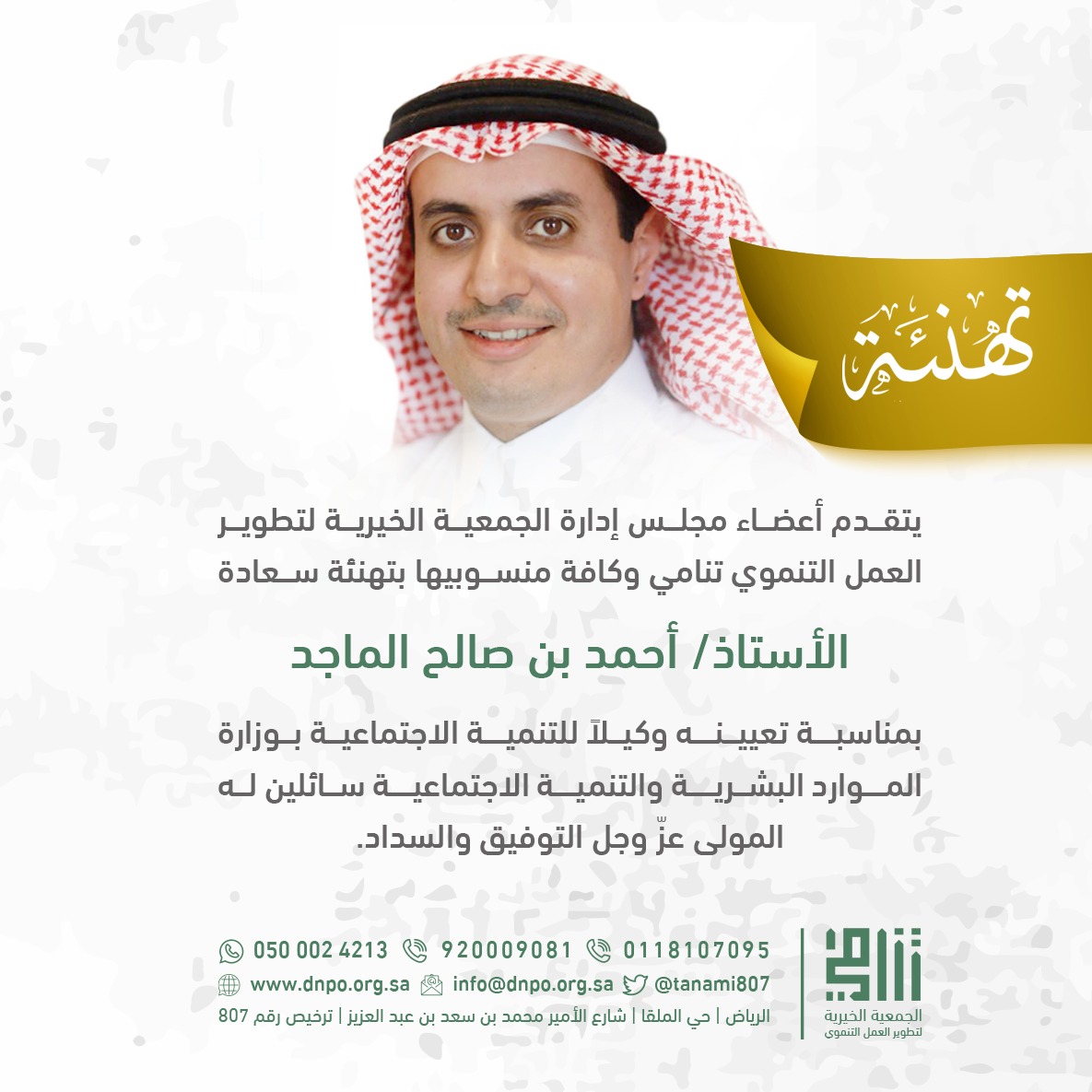 يتقدم أعضاء مجلس إدارة الجمعية الخيرية لتطوير العمل التنموي تنامي وكافة منسوبيها بتهنئة سعادة الأستاذ/ أحمد…
